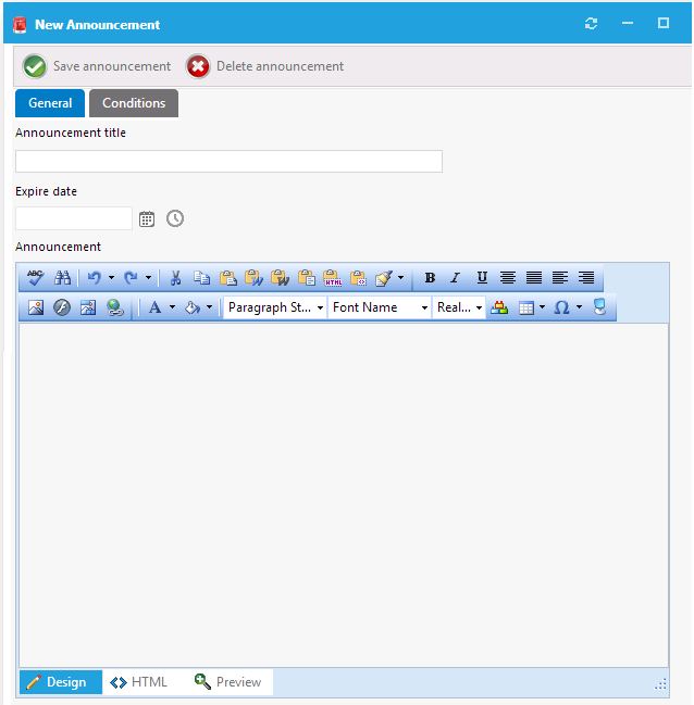 In the Expire date field, enter the date and time after which you no longer want this announcement displayed. If you do not enter an Expire date, the announcement will not expire.