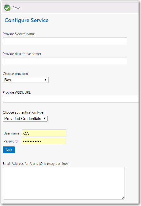 Note: Do not use any special characters in the URL field. The only special character that is permitted is _ (underscore). Dashes (-) and other special characters are not permitted.Choose authentication type Select either Provided Credentials or Integrated to indicate the authentication type. If you chose Provided Credentials, you also need to enter a User name and Password. Test Click to test the service settings Email Address for Alerts Enter email addresses, one entry per line, to be notified when alerts are generated in relation to this service. -