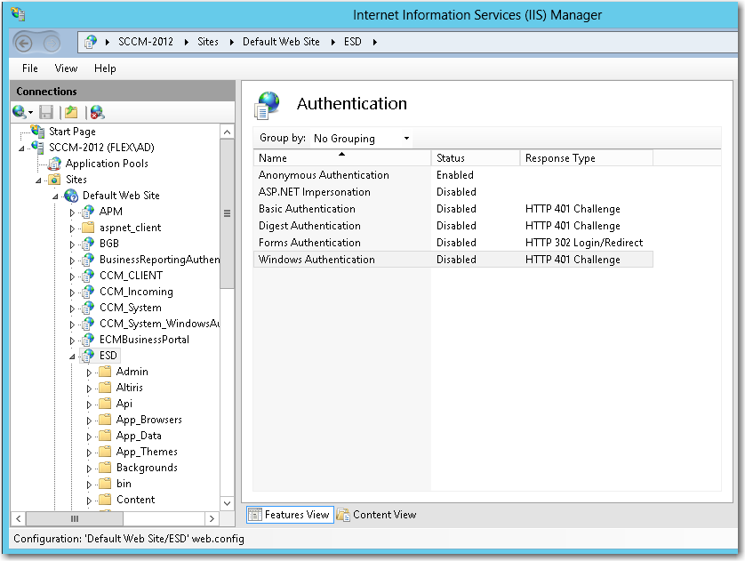 To use single sign-on functionality, make sure that anonymous authentication is enabled in IIS for the ESD site and that Windows Authentication is disabled.