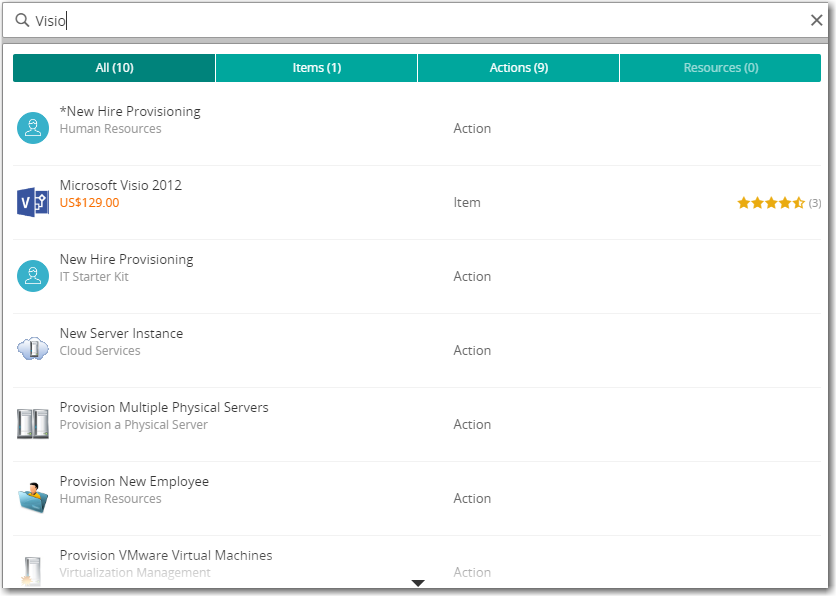 Search for the published services (catalog items) by entering text in the Search text box. A list of search results appears in a pop-up dialog box: