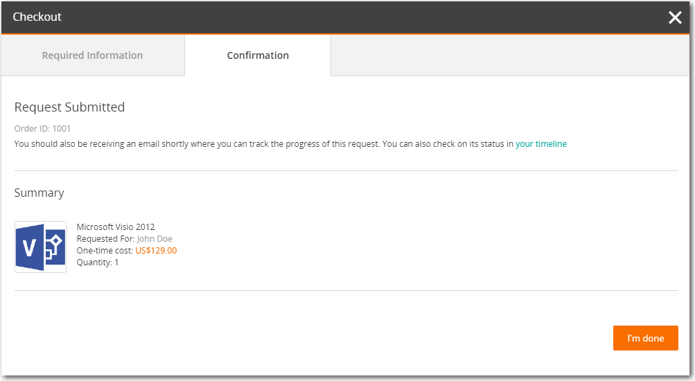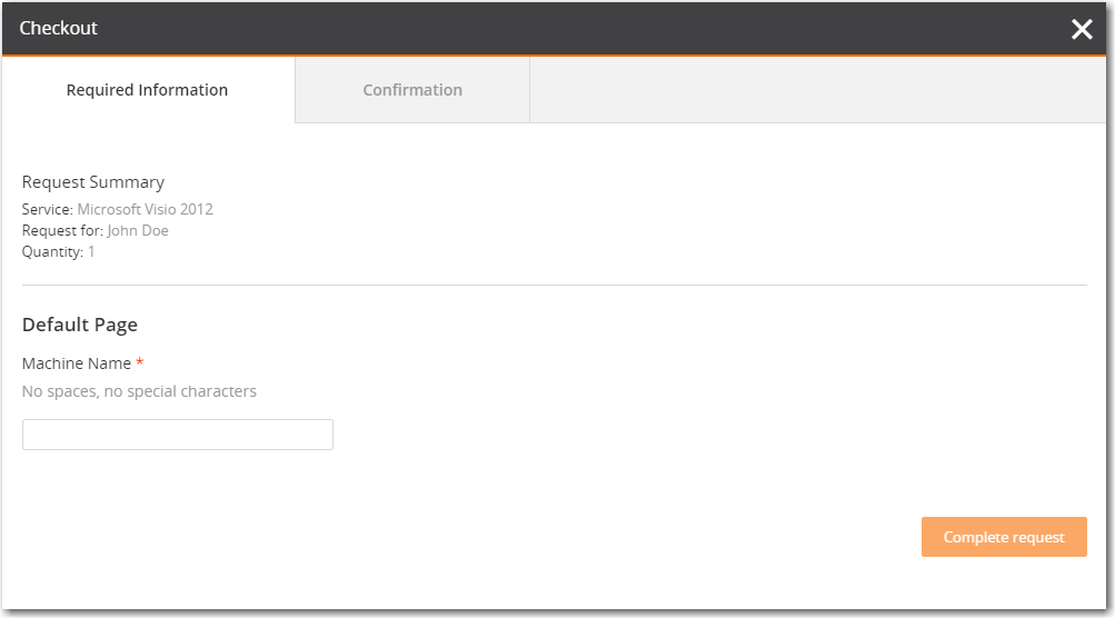 Enter the Machine Name and click on the Complete request button. The Confirmation tab of the Checkout process opens and the Request Submitted message is displayed.
