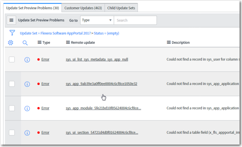 Repeat this procedure until all errors are resolved. You may select multiple errors at a time. When all errors are resolved, the Commit Update Set button is enabled.