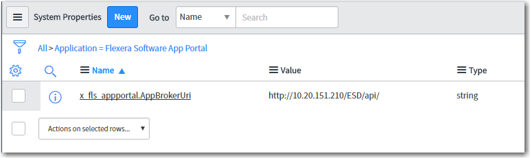 15. To connect ServiceNow to your instance of App Portal, click on x_fls_appportal.AppBrokerUrl. The System Property view for that property opens.