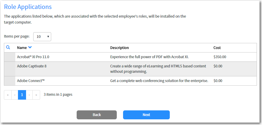 Click Next. The Role Applications panel opens, listing the applications that are associated with the selected employee’s roles, which will be installed on the target computer.