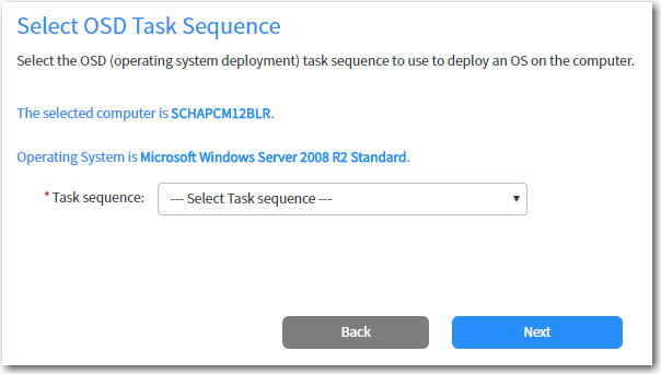 8. After you select a computer to update, click Next. The Select OSD Task Sequence or Select Non-OSD Task Sequence panel opens, listing the name of the selected computer and its current operating system.