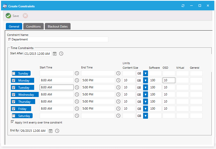 In this example, the requester would only be able to select a time range for installation between 8:00 a.m. and 5:00 p.m. on Monday through Friday. Saturday and Sunday would have any time available.Limits Content Size To limit the scheduling based on the total content size for items being delivered for others that meet the same constraint, enter a limit (in KB, MB, or GB). This limit is calculated by totaling the SCCM package size for the requested items for that day.