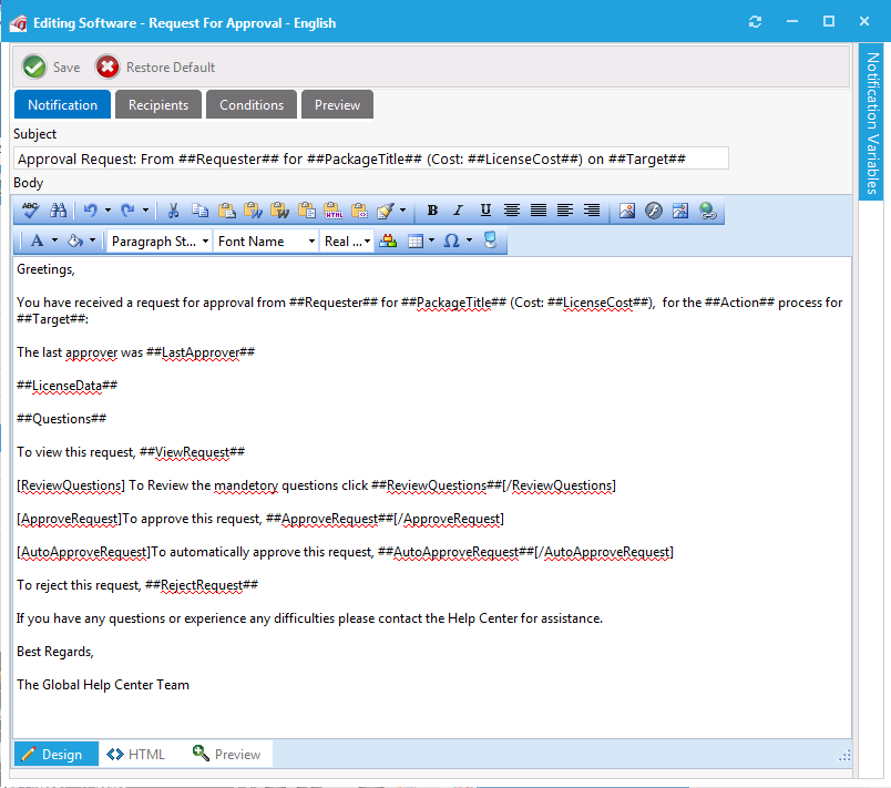 • When editing notifications, you can customize them to match your company brand by including company fonts, colors, and logos.