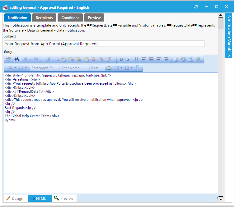 5. To insert a variable into the email, click on the Notification Variables button on the right side of the dialog box to open the Notification Variables dialog box, select a variable from the list, and click Add.