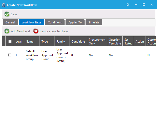 • For example, under User Approval Group (Static), select Default Workflow Group and then click Add Selected Group. The new workflow step is now listed on the Workflow Steps tab.