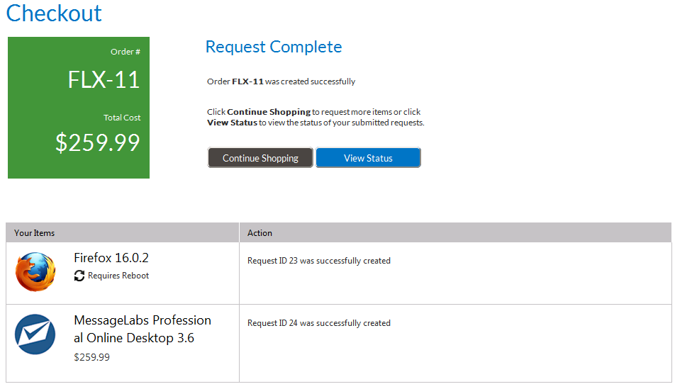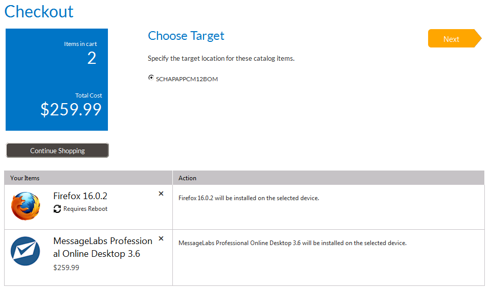 The level of interactivity during the checkout process depends on the request options and rights of the requester. The Choose Target panel is only displayed if the user has the ability to request to a device other than their current one, or if the item allows for both install and uninstall. In the absence of these choices the Me on machine MYCOMPUTER and Install options are selected by default and the checkout is automatically advanced to the next panel.