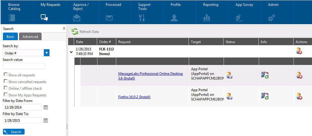 10. If an Approval Template was associated with this catalog item, the Pending approval icon will be displayed in the Status column. For more information, see Approving a Request.